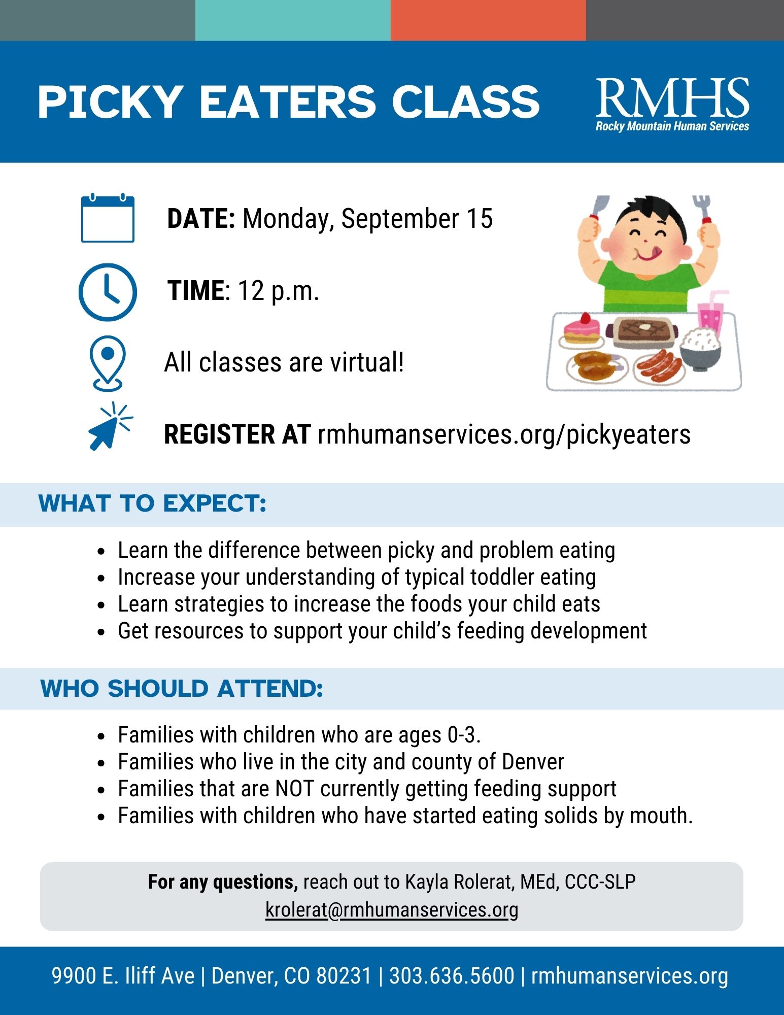 A flyer from Rocky Mountain Human Services (RMHS) titled “Picky Eaters Class.” Date: Monday, September 15 Time: 12 p.m. All classes are virtual. Register at: rmhumanservices.org/pickyeaters Illustration of a smiling child in a green shirt holding utensils with a tray of different foods in front of them. What to expect: Learn the difference between picky and problem eating Increase your understanding of typical toddler eating Learn strategies to increase the foods your child eats Get resources to support your child’s feeding development Who should attend: Families with children who are ages 0–3 Families who live in the city and county of Denver Families that are not currently getting feeding support Families with children who have started eating solids by mouth For any questions, reach out to Kayla Rolerat, MEd, CCC-SLP at krolerat@rmhumanservices.org . Footer: 9900 E. Iliff Ave | Denver, CO 80231 | 303.636.5600 | rmhumanservices.org