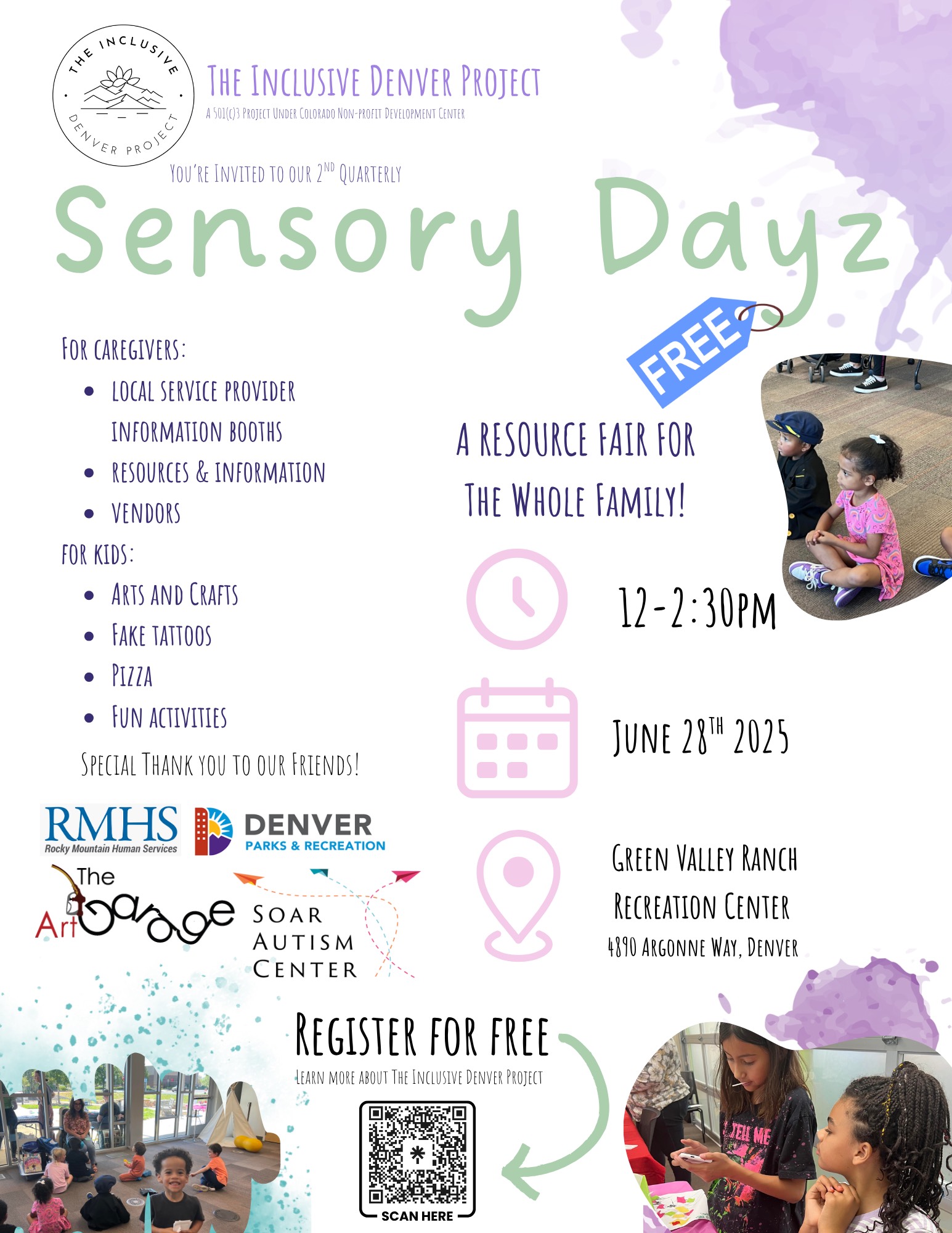Flyer for “Sensory Dayz,” hosted by The Inclusive Denver Project, a 501(c)(3) project under the Colorado Non-Profit Development Center. The event is titled “You’re invited to our 2nd Quarterly Sensory Dayz.” It is described as FREE and “A resource fair for the whole family!”
