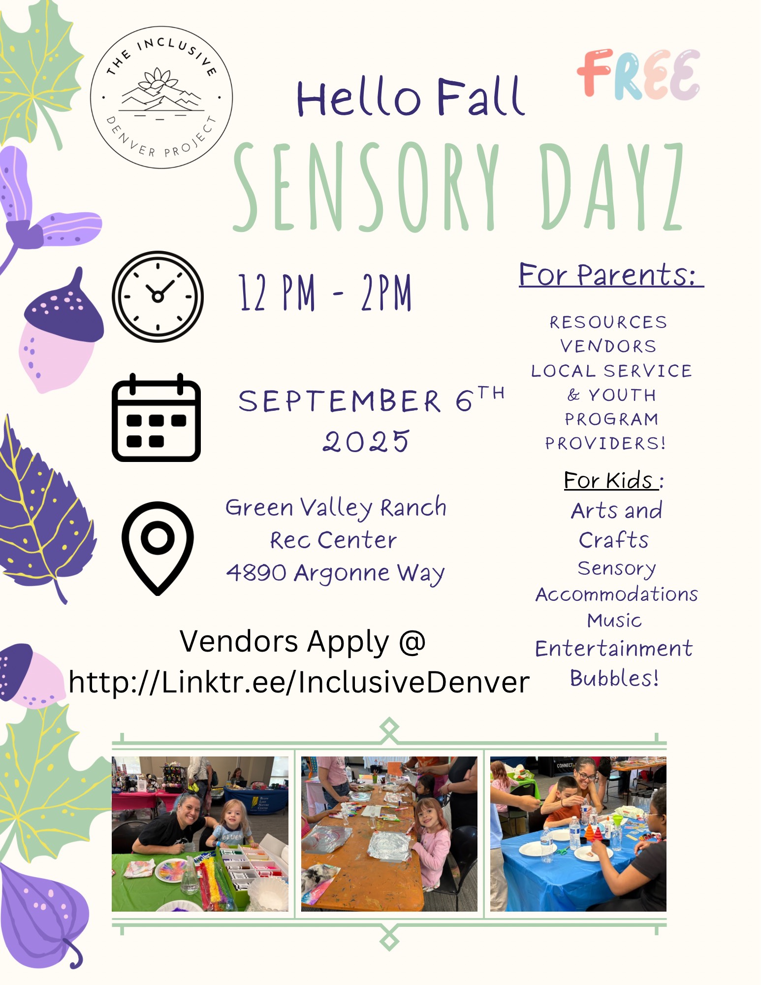 Flyer with decorative fall leaves and the logo of “The Inclusive Denver Project.” The text reads: “Hello Fall. FREE Sensory Dayz. 12 PM – 2 PM. September 6th, 2025. Green Valley Ranch Rec Center, 4890 Argonne Way. Vendors Apply @ http://Linktr.ee/InclusiveDenver.” For Parents: Resources, Vendors, Local Service & Youth Program Providers! For Kids: Arts and Crafts, Sensory Accommodations, Music, Entertainment, Bubbles! At the bottom, there are three photos: A person and a child smiling while doing arts and crafts with paint. Children sitting at a long table covered in orange with art supplies and crafts. A group of children and adults at a blue-covered table painting and creating together.
