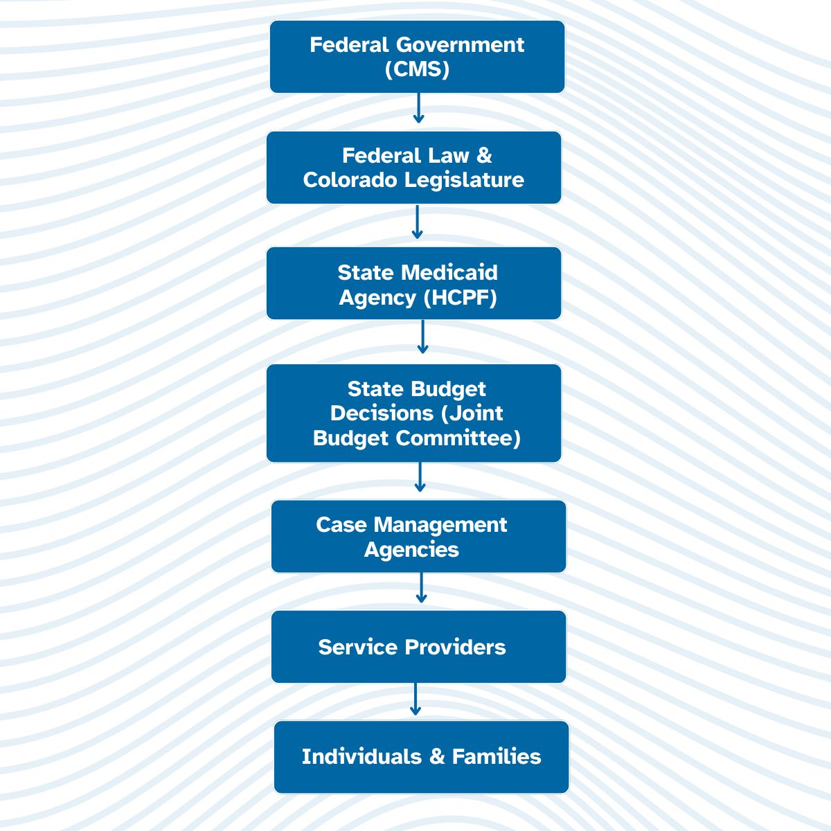 This structure is simplified, but it illustrates an important point: decisions about policy and funding often originate at the federal or state level, while the day‑to‑day experience of the system happens closest to individuals and families.